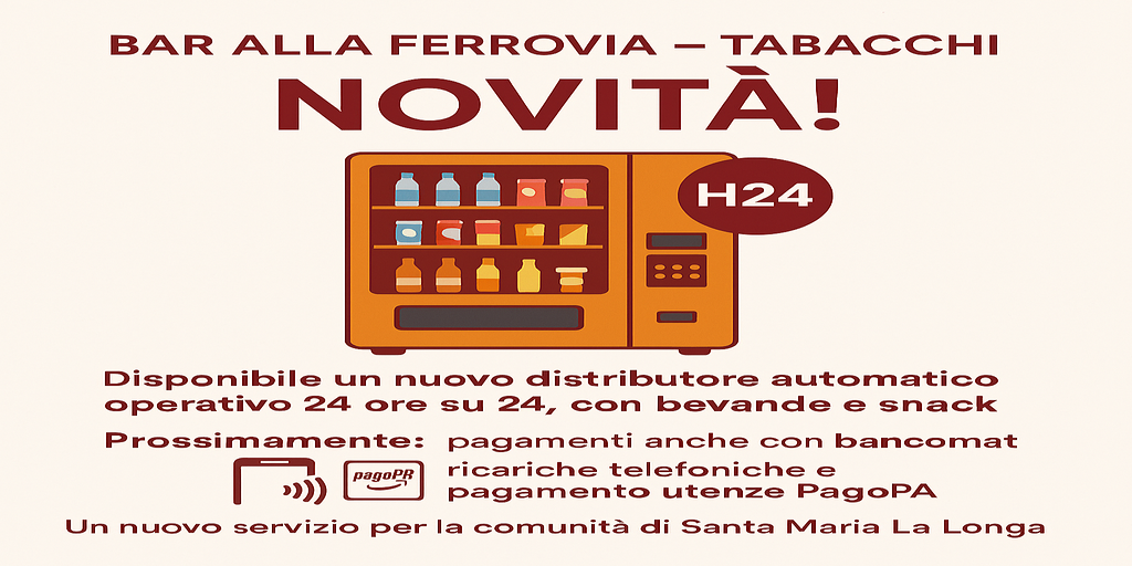 Il distributore H24 del Bar Edicola Tabacchi "Alla Ferrovia" è pensato per adattarsi al tuo ritmo di vita. È la soluzione ideale per fumatori che necessitano di sigarette o ricariche Terea a qualsiasi ora, e per i giovani in cerca di uno snack o una bevanda fresca. Il nostro servizio è attivo 24 ore su 24, garantendo che le tue esigenze siano soddisfatte in qualsiasi momento, giorno o notte.